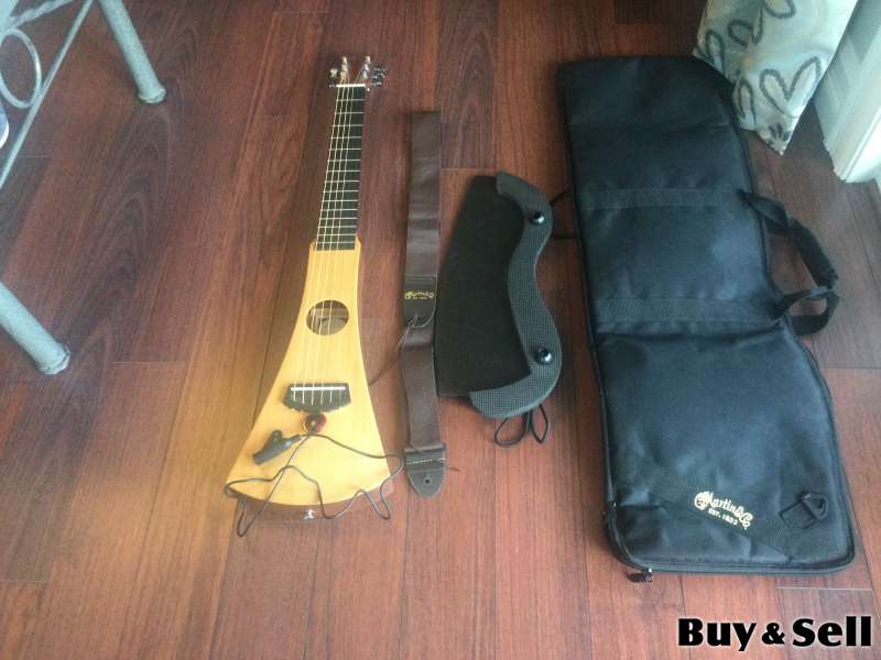 ACOUSTIC Guitar Martin, Steel string with gig bag, excellent condition, Martin original shoulder strap, guitar stabilizer (play guitar without using strap), mini pickup contact microphone transducer, solid spruce top, spruce body, mahogany neck, wood fretboard, right hand orientation, solid tone wood back and sides, scale length is 24 inches, 15 frets, serial # 247683, separate set of D’addario nylon extra light gauge strings
