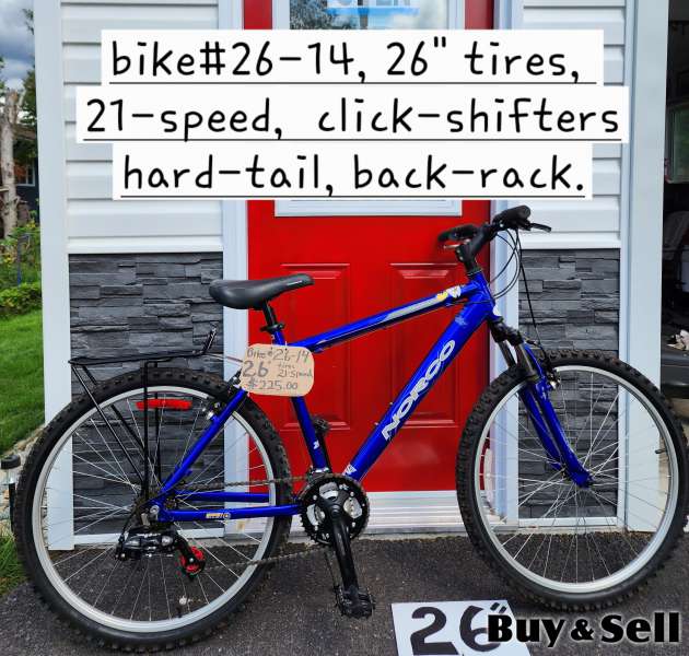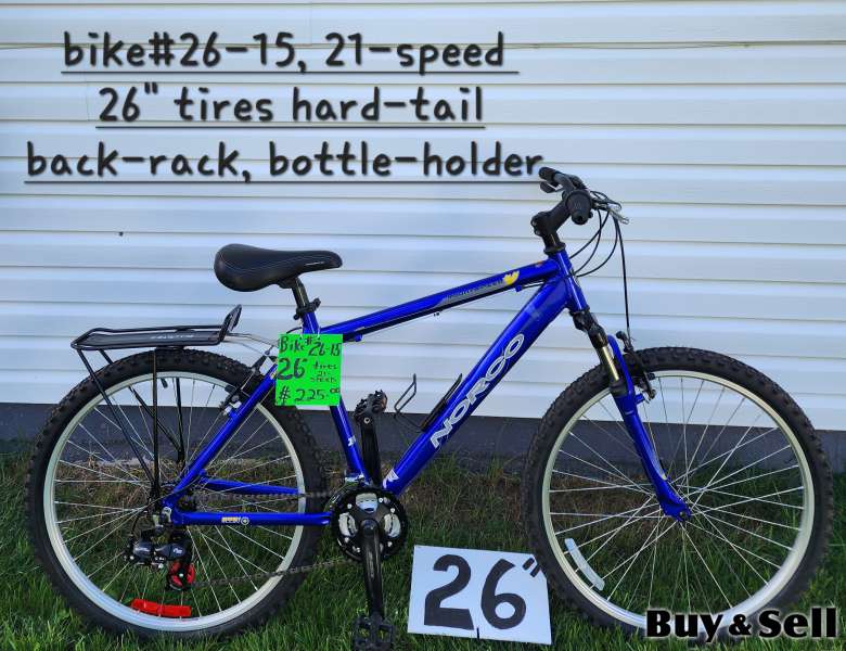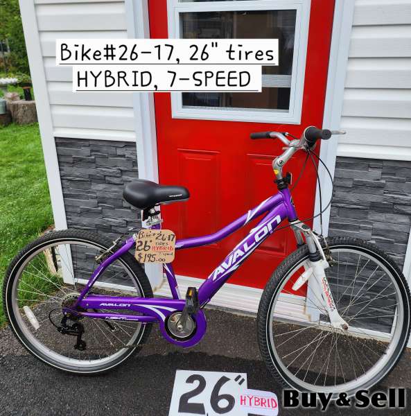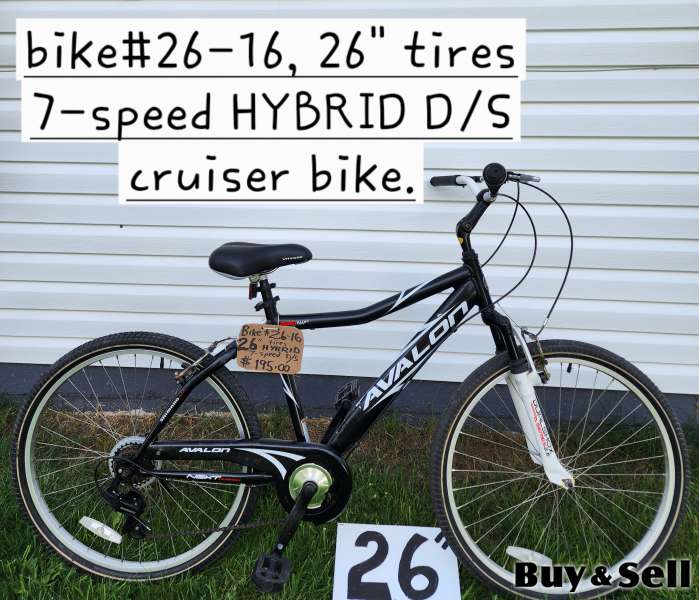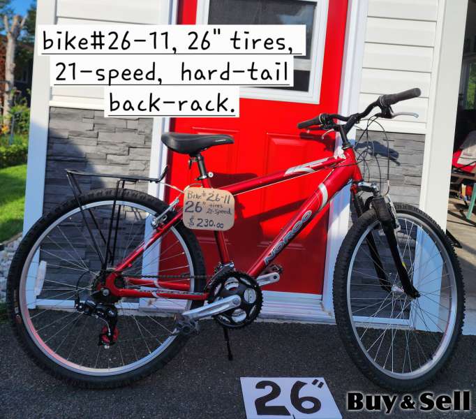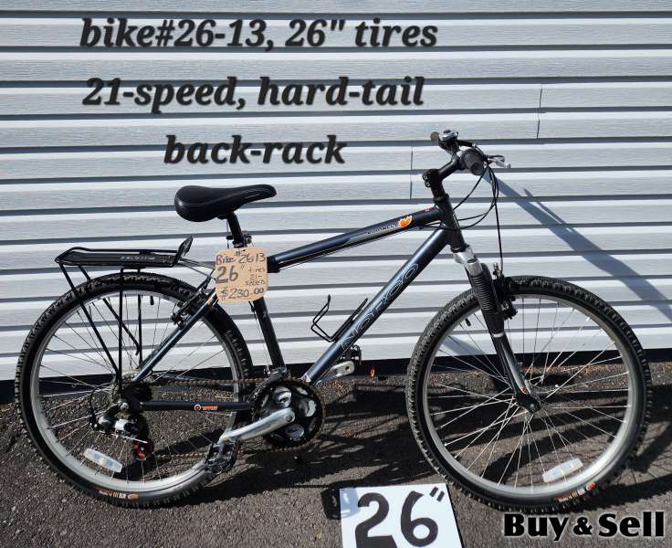 BICYCLES, 26" tire bicycles for sale. Mountain, cruiser, hybrid, street bikes refurbished, all individually priced with a bike number.