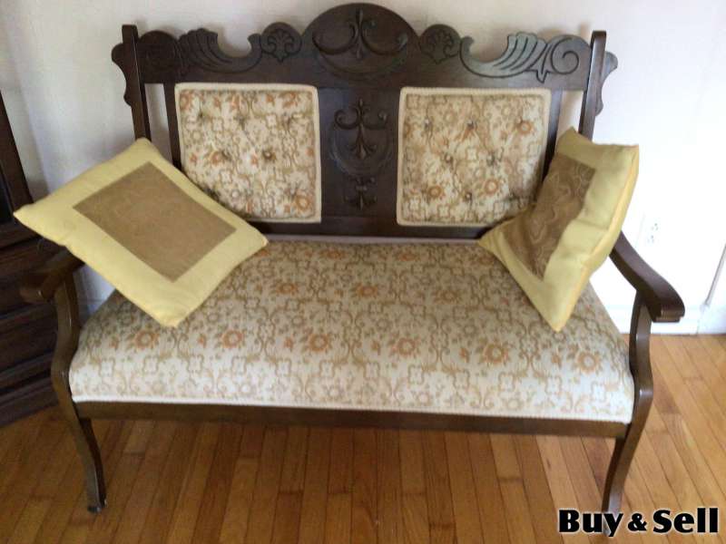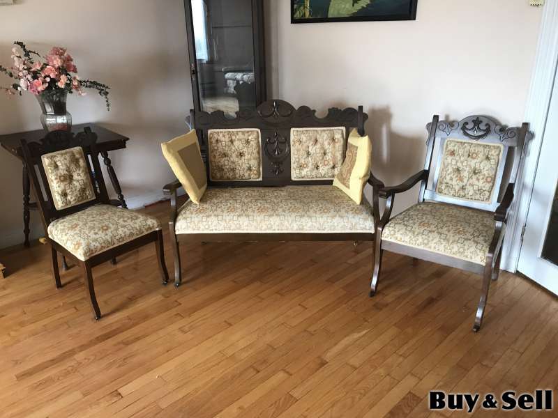 ANTIQUE Loveseat And Two Chairs, Three piece upholstered antique love seat and two chairs on wheels.