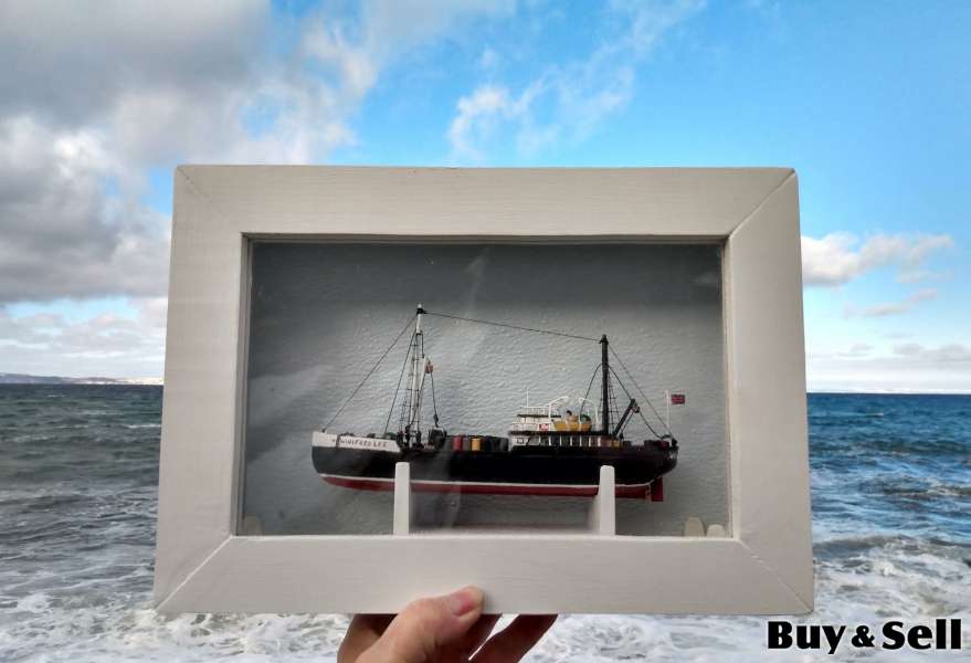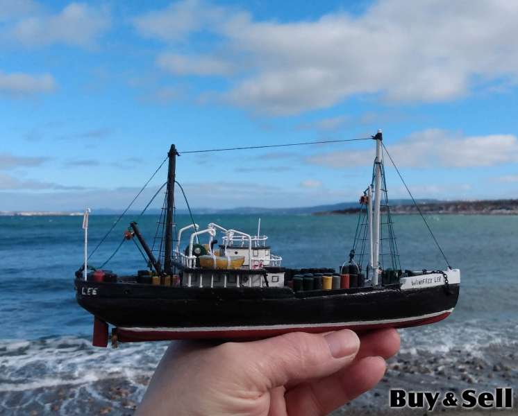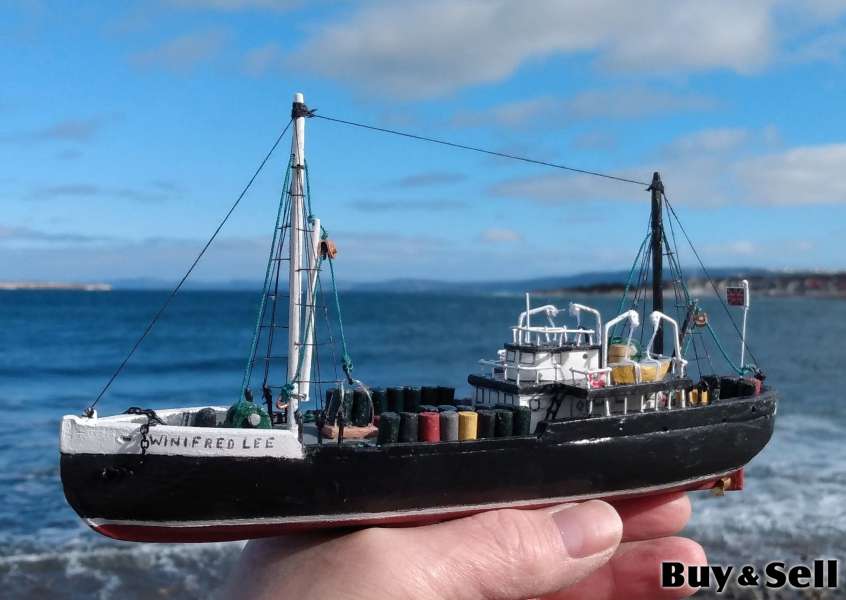 MODEL Boat., Hand crafted 8 inch model of the 95 foot long WINIFRED LEE 1916 - 1955. For years this ship was servicing the coast of Labrador. On Sept 5th 1955 while at the wharf at Twillingate with a load of hay stored below deck and 100s of drums of kerosene and other fuels on the upper deck, smoke was seen coming from the lower deck. Thanks to the Captain and crew of the boat Shirley Louise who went aboard and attached a rope and towed her out in the middle of the Harbour, where she burnt to her waterline.