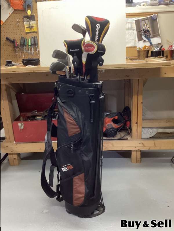 SET Of Left Hand Golf Clubs, Including Taylormade R5 driver, Taylormade #3 and #4 fairway rescue irons with bag.