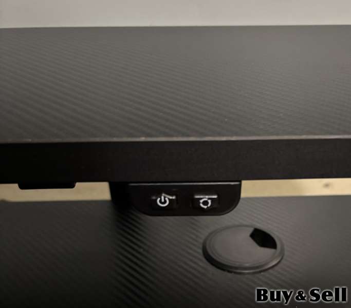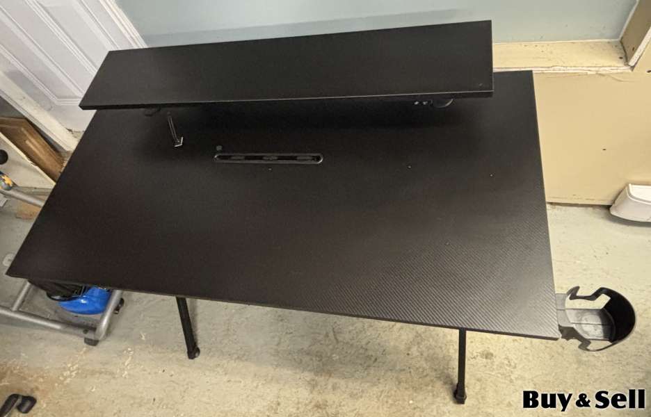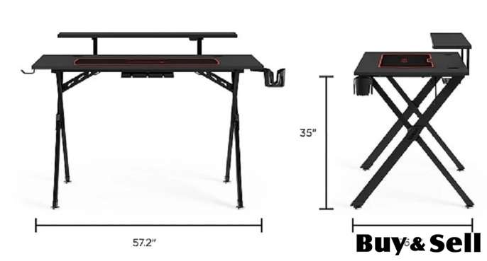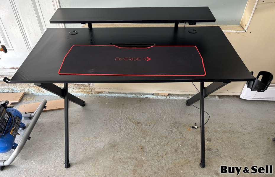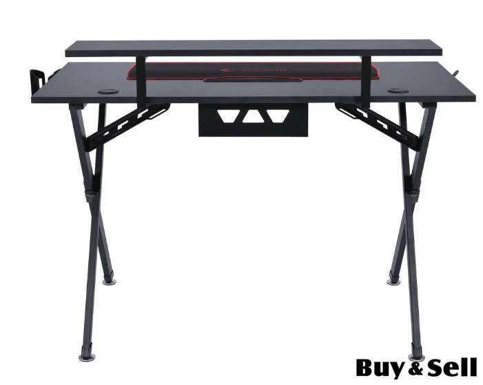 LED Gaming Desk, Black and carbon fiber laminate gaming desk. Raised monitor platform and 6 colour LED lighting strip. Headphone hook and cup holder attachments for storing accessories. Cable management tray, cable slot, and grommets for organization.