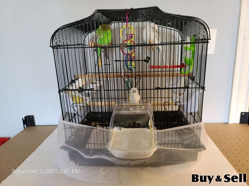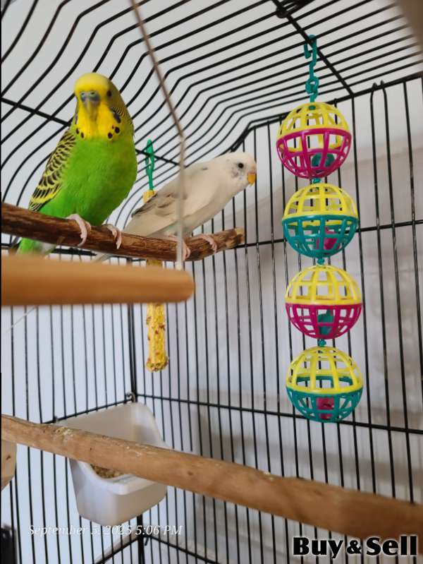 7 month old budgie birds for sale. Tango is the green male, Ziggy is the white female, with spots of blue. Comes with cage with pull out bottom, toys, 4 gallons of food, treats, cuttlefish bones, mineral blocks, seed catcher netting for the cage, drop tray liners, bird bath. 2 water bowls and 2 feed bowls.