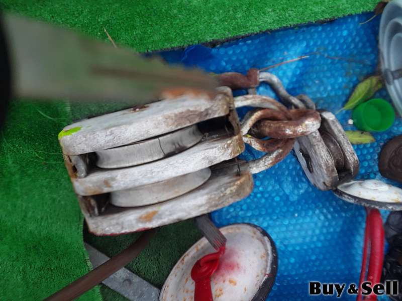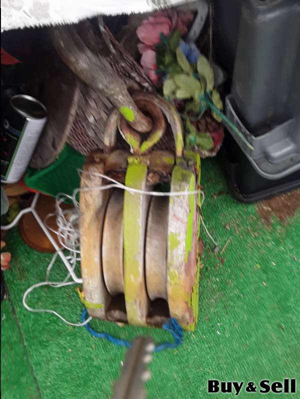ANTIQUE, A large antique double pulley block and tackle hoist is a mechanical system comprising two blocks, each containing one or more pulleys (also known as sheaves), with a rope or cable threaded between them. This arrangement is designed to provide mechanical advantage, making it easier to lift or pull heavy loads by amplifying the applied force [1] [2]. These hoists were historically crucial in various applications, including maritime activities, construction, and agricultural tasks, and are now often sought after as collectible or decorative items