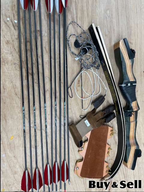 Perfect beginer bow or learning proper form before going up on draw weight. Includes 10 practice arrows, arm protector, finger protection, bow stringing device. Very little use as I need a much longer bow for my draw length and height.