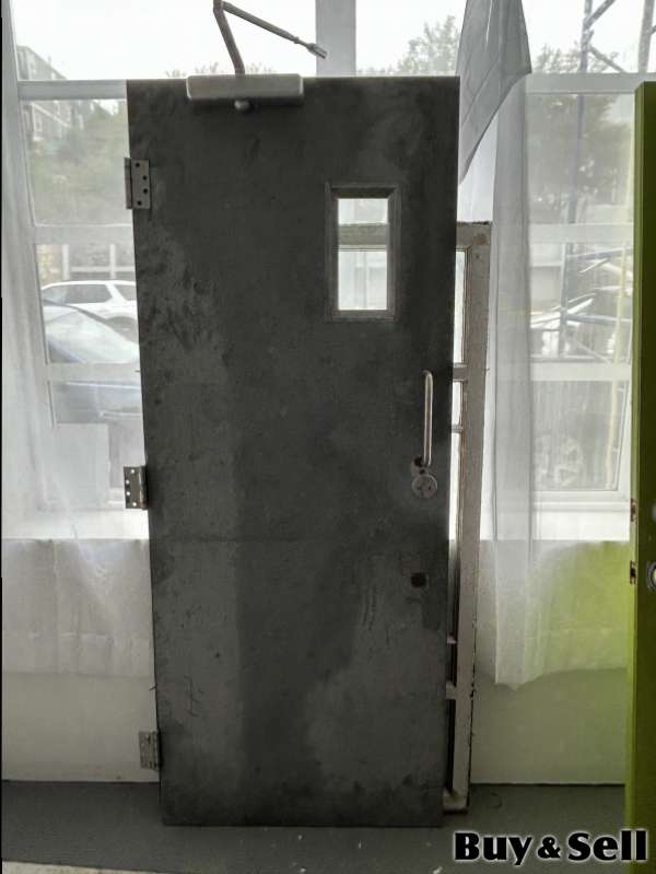 DOOR, STEEL Door, Industrial-grade steel security door with a built-in rectangular viewing window and overhead door closer arm. Perfect for commercial buildings, basements, or secure entry points. Built to last with a thick metal frame and handle. Lockable with padlock setup.
