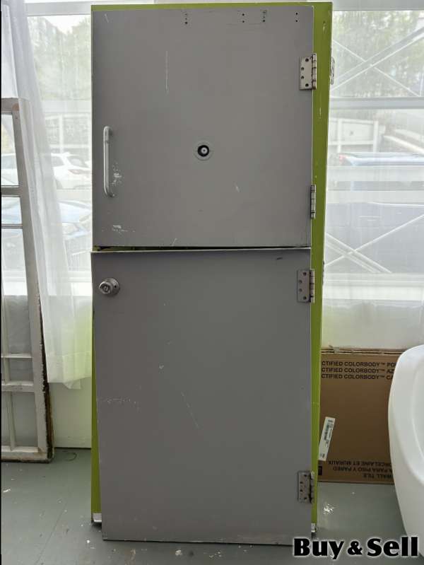 DOOR, DOOR, Heavy-duty metal dutch doors — ideal for industrial, workshop, or secure storage use. Features sturdy hinges, locking mechanisms, and a peep hole on the upper door. Painted gray with lime green trim for a bold, modern-industrial look. Shows some cosmetic wear (scuffs/scratches) but fully functional. Comes with metal door frame.