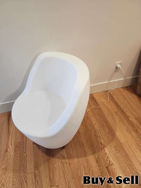 CHAIR, ONE-OF-A-KIND Glowing Led Chair, Very unique. Translucent chair - just plug it in, and the internal LED light glows softly in multiple colours. Remote control allows you to choose the colour - to suit your mood, match your decor, or impress your friends. Clean, modern, minimalist design looks very cool, indoors or outdoors. A very unique, one-of-a kind conversation piece. Perfect for TV room, games room, kids room, or lounge - or outdoors. Great conversation piece for Christmas and holiday gatherings. Brand new. Never used. Retail price $500 and up.