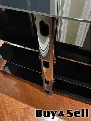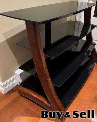 WOOD And Black Glass Tv Console, Must go! Make me an offer! Stunning dark wood and tempered black glass sturdy TV Console with 4 shelves. Has a simple and modern design. Free your home theater space from clutter with this console, which features a cord-management system to conceal the cables connecting your A/V equipment. This versatile furniture provides plenty of space for all your entertainment components, gaming systems and accessories Whether you plan to use it in the living room, game room or other entertainment area, this media stand is perfect for any space!! 42” wide 30” high 20” deep