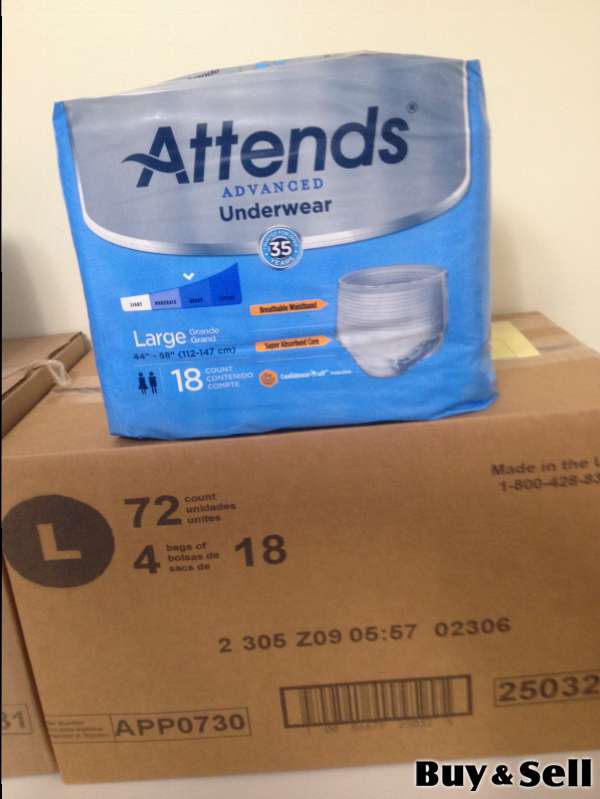 UNDERWEAR, LG Attends underwear from smoke free home. Each sealed box has 4 packs 18 (NOW 20) in each pack $40 a box FIRM! Thats only $10 per package. No holds so don't message until the sameday you plan on picking it up. If this add is up it's available. PICKUP ONLY!! in the west end off Brookfield Rd. I WILL NOT reply to is this available.