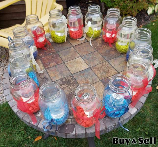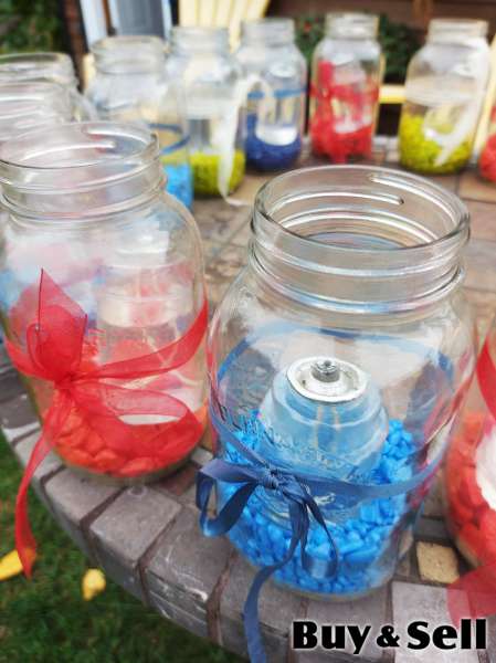 MINI Oil Candles, Mason Jar (1 Litre) lanterns with mini oil candles and decorative rocks. Wicks and oil included. Perfect for Christmas. Used once. Take all 16 jars for price listed.