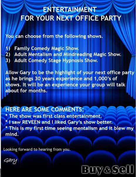 Entertainment Magic and Hypnosis entertainment for your next office party. Price: $500.00 Location: St. John's (Avalon) Phone: 709-576-XXXX Click to show Views: 7 Price: $500.00 Location: St. John's (Avalon) Phone: 709-576-XXXX Click to show Report