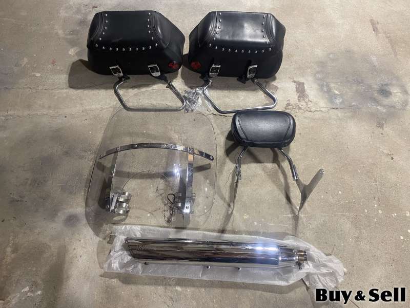 SADDLE Bags,muffer,backrest,windshield, Yamaha vstar 950 accessories all came off a 2009, but should fit other years. Willing to sell separately or as a package for $325.00! Located in BONAVISTA!