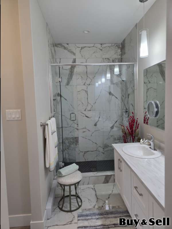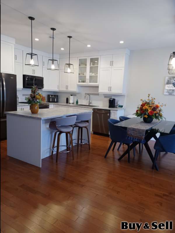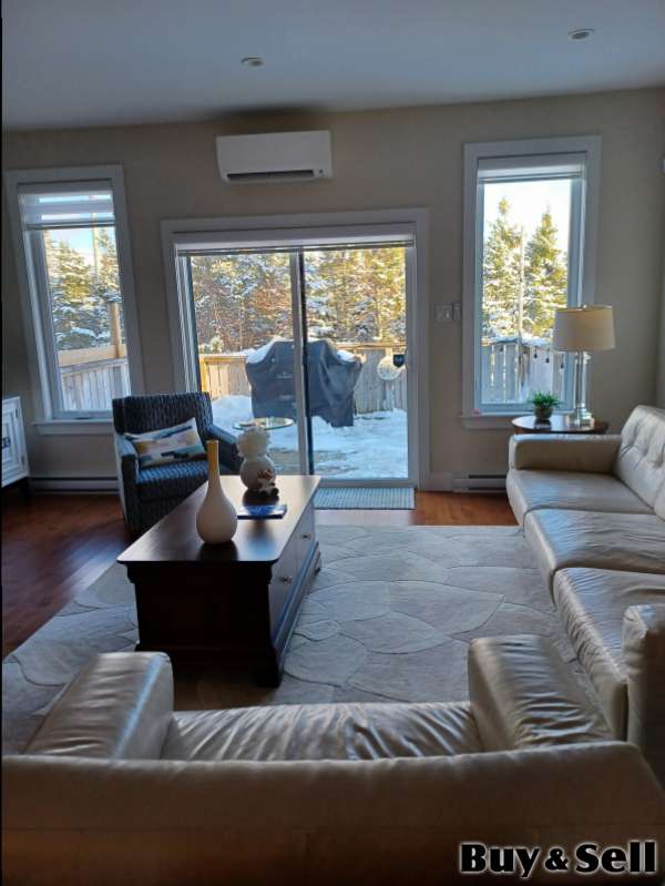 Patio/Town Home on Clifden Woods Place, Galway, St. John’s, NL, center unit, built in 2019. Main floor is approximately 1,440 sq. ft with 317 sq. ft. attached garage. Walk-out basement level, with patio door has 1,440 sq. ft. Unit has 3 bedrooms, 3 full bathrooms, rec room, workshop and storage area with a seasonal walk-in closet at basement level. Master bedroom has an ensuite w/shower and double vanity, 2 closets, one of which is walk-in. Heating is by mini-split and electric baseboard heaters, also has a propane fireplace in the living room. Laundry on main floor. 9 ft. ceilings throughout; shaker style kitchen with large island. Mixed flooring, hardwood, laminate, ceramic tile. Lot size: 32’ x 120’. Freehold.