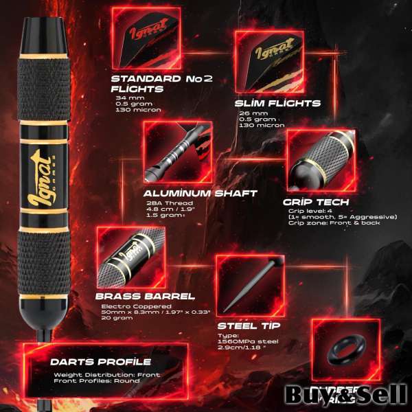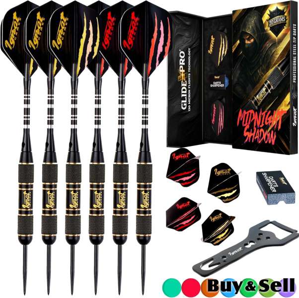 Materials & build: 6x 20 g knurled brass barrels, tempered steel points, and aluminum shafts with rubber O-rings