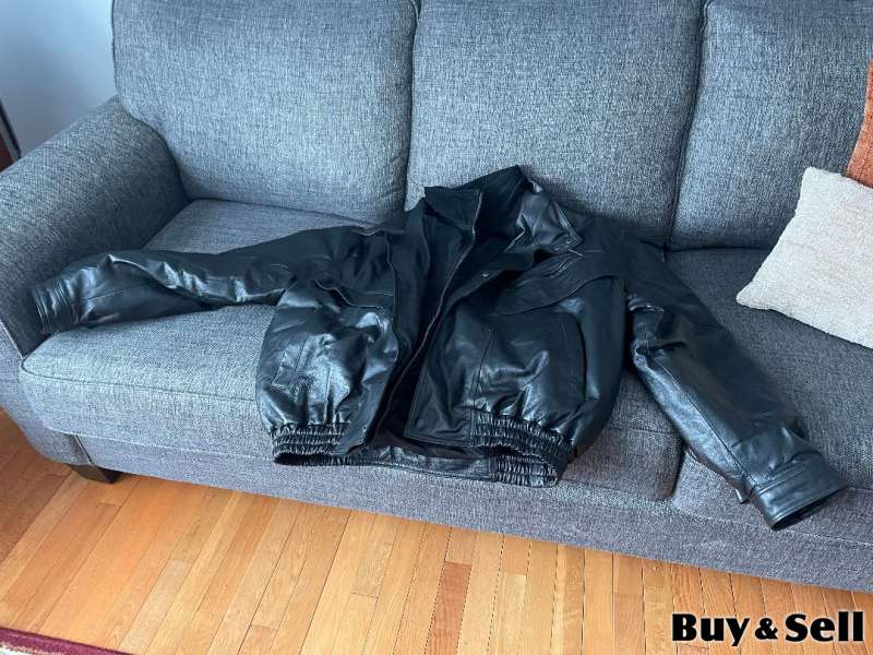 MEN'S Leather Bomber Jacket - Xl, MEN'S PELLE CUIR, LEATHER LINED Bomber Jacket, Black, size XL. From smoke and pet free home. In excellent condition as photos show. Would make a get Valentine gift !! $55.00, located in CBS, text 709-730-3756.
