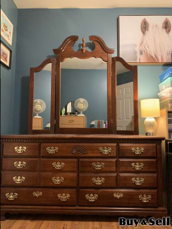 DRESSER, Height to top of mirror is 80", Width of bottom portion with drawers is 64", Depth is 18". Has minor scratches and wear. Pickup only. Will need two people to carry , since it is heavy real wood. Asking $90