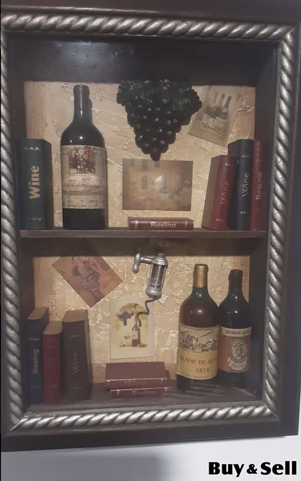 PICTURE, 12" x 16" Picture with miniature bottles & books set in a frame. This is not homemade. Ideal for rec room or bar or man or woman's cave. Perfect condition.