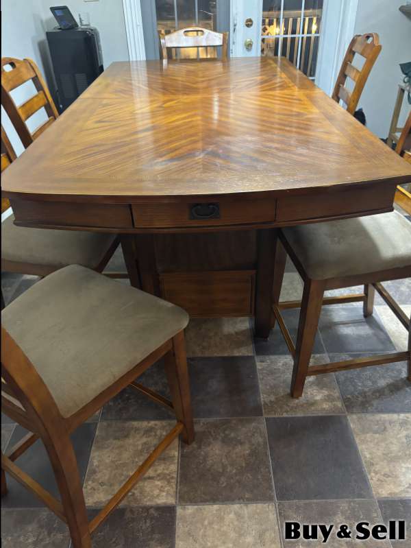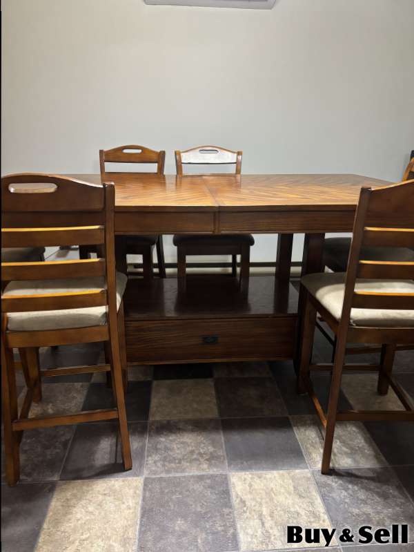 7 Piece Pub Height Dinette, Pub height dinette with 6 chairs. Storage drawer in middle with smaller drawers at either end. 78” x 40” expandable to 96” with centre insert.