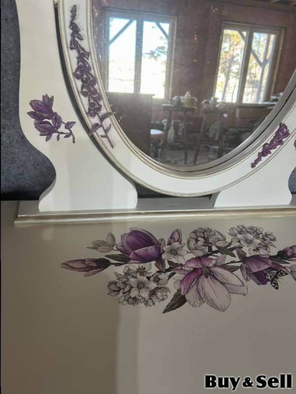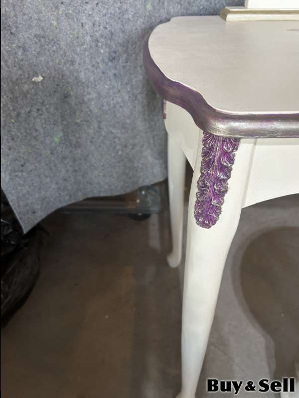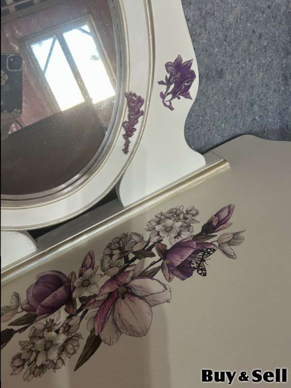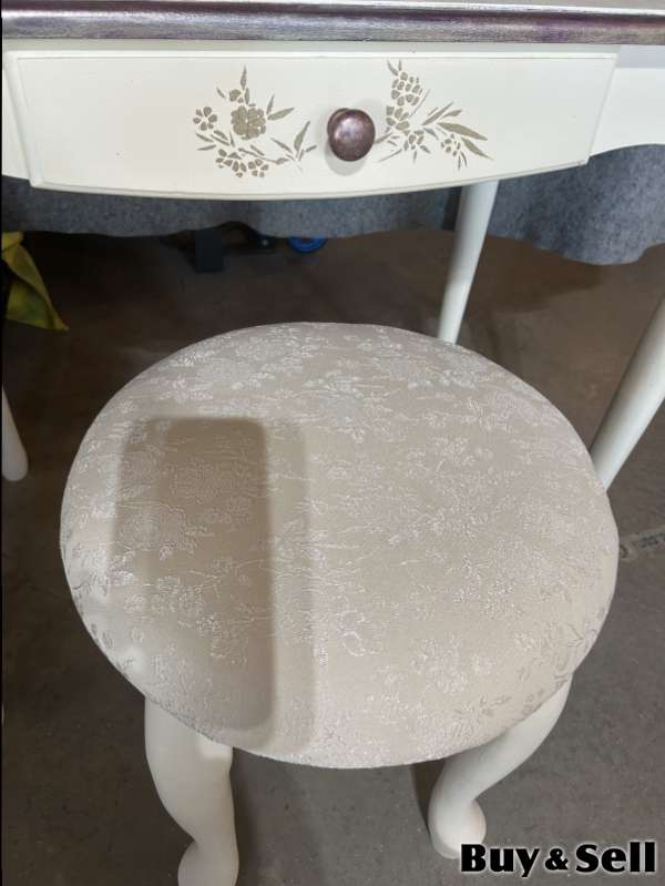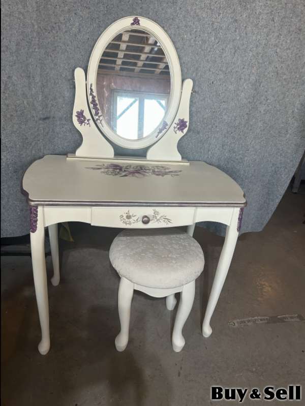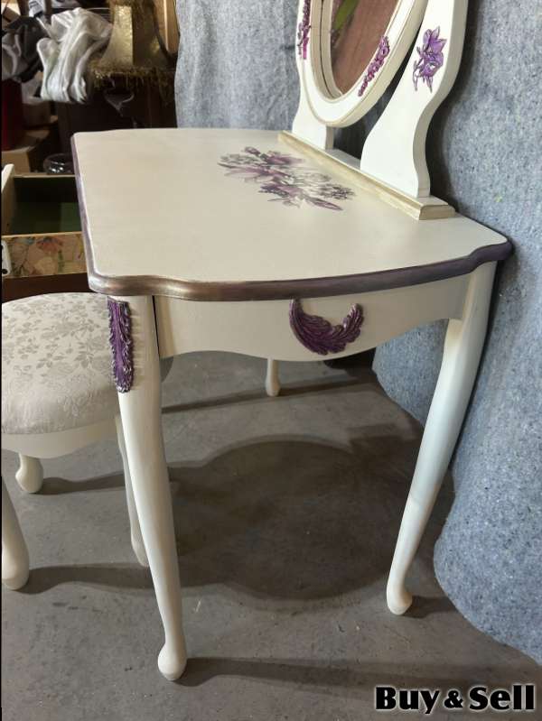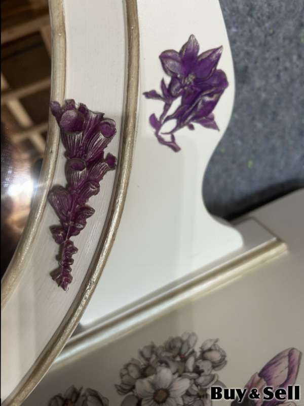 TABLE, Charming vanity set. It’s a cream colour with pretty pearl floral design handmade moldings, great for bedroom or dressing area. The table is larger than most and is solid wood. Floor table.29” D 20” W 34”