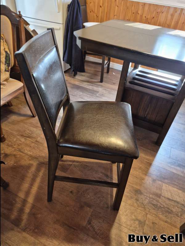 PUB Style Table And Chairs 42x54, Pub Style table and 4 chairs solid wood and good shape with a wine rack under Table has a couple of small scratches you can see in photos. Item is in Victoria size 42x54 but can deliver to St. Johns