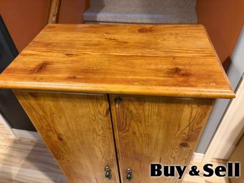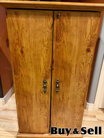 CABINET, Storage cabinet (4 shelves plus 8 door shelves), comes with lock & key, brown and very sturdy laminated wood, scratch on bottom panel but other than that, in excellent condition.