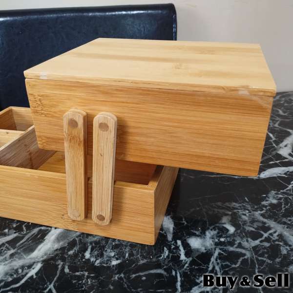 ORGANIZER, Perfect for storing toiletries, cosmetics, and jewelry. Has a hinged second layer, six sections (removable), two magnets on front, and top can be removed.