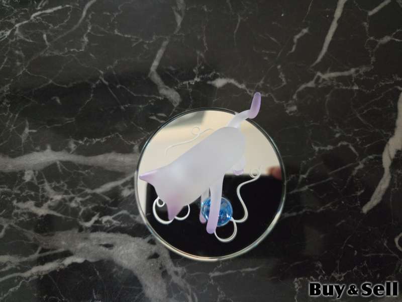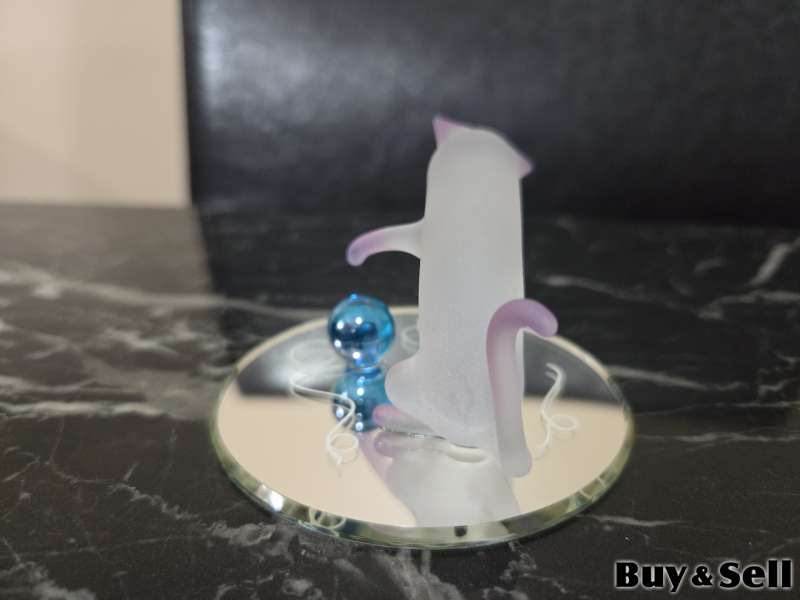GLASS Figure, Handcrafted glass art of cat playing with marbles on a decorative hand-beveled glass mirror. Cats eyes are Swarovski crystals.