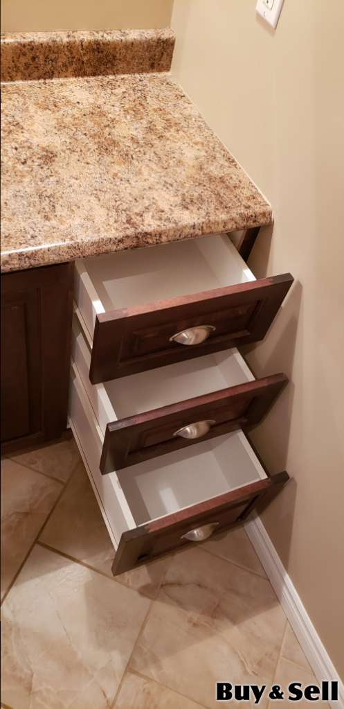 VANITY Set, Cabinets with drawers and a shelf. Brown wood with a Brown Laminate top. Comes with nickel knobs for the doors and drawers. The mirror is a dark brown colour.