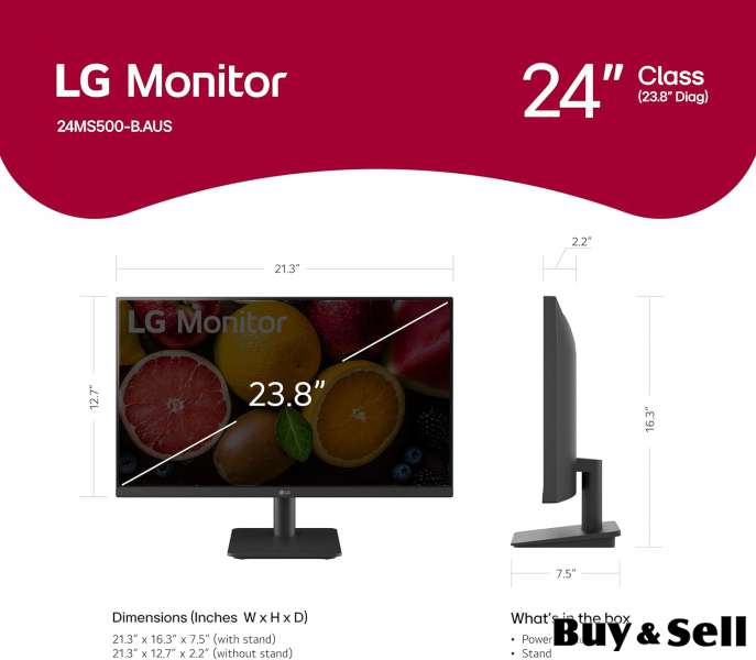 COMPUTER, New 24" LG monitor, model #24MS500, still in the box. I used this for only 2 days! I purchased a larger monitor to match my other one, so I don't need this one anymore. Included in the box >>> the stand, 1 HDMI cable, a power adapter and a manual. I purchased on Amazon for $250.00, I lowered the price to $125.00! (Was $150.00!) See pictures for some specs and info. Check it out on Amazon for more info.