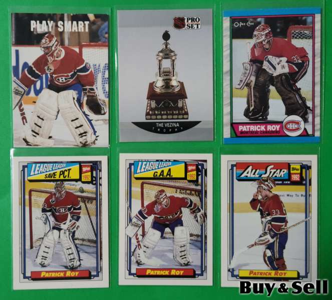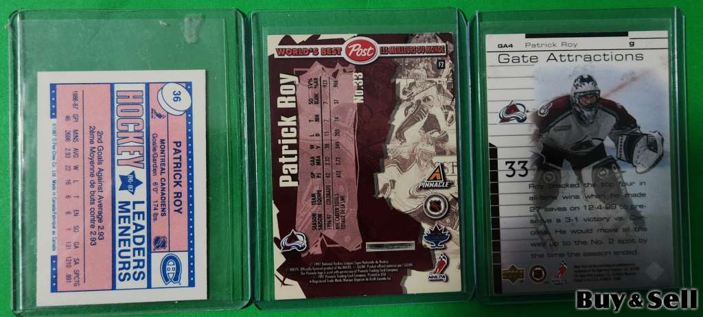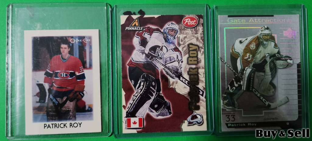 HOCKEY Cards, 13 Patrick Roy hockey cards with base cards, inserts, a jumbo card from 1987 to 2000. See photo's to judge your own condition as I'm not a pro card grader...I only mention what I think the condition is. I'm asking $15.00 for all 13 cards. I'm in Bay Roberts.