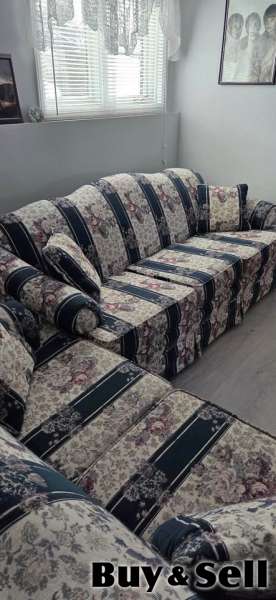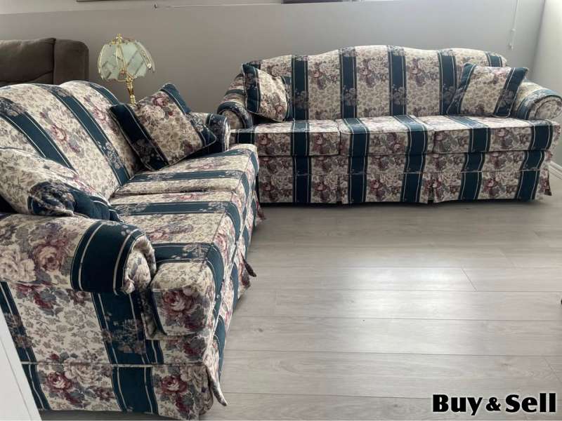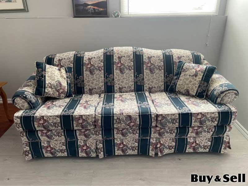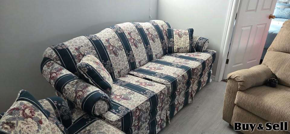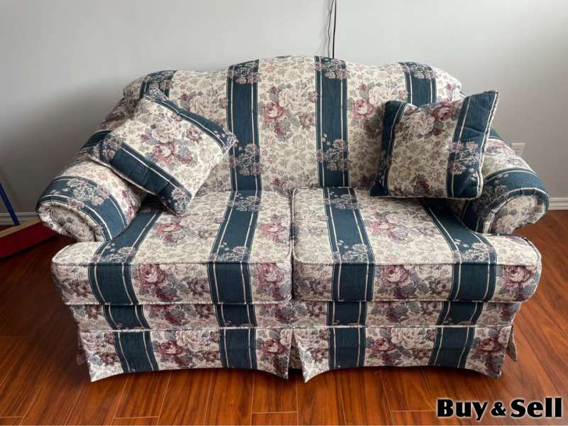 COUCH Loveseat, Charming floral stripe sofa and loveseat set. Has pretty floral pattern with dark blue stripes and cream background. Cushions are comfy. Good for a living room or den.