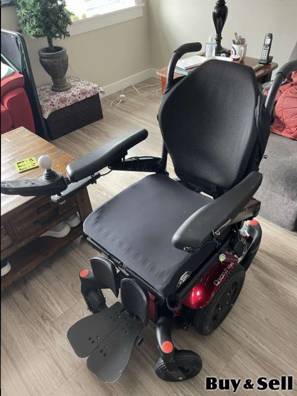 QUICKIE Q600 Mini, Wheelchair is 4 years old and only used indoors. New batteries within last 3 months. Mid wheel drive wheelchair great for small spaces. Currently 16” x 16” but seat frame is adjustable. Includes firm back cushion.